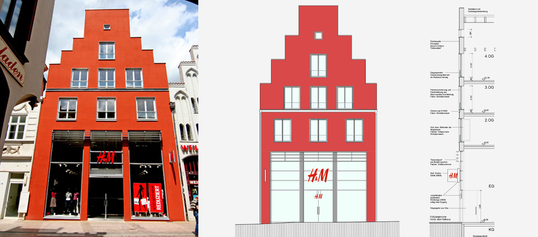 Die neue Fassade mit Treppengiebel hebt sich durch die Modernität und Farbgestaltung formal von den historischen Nachbarfassaden Hinter dem Rathaus 21 und 25 ab. Sie übernimmt die Aufgabe des unaufgeregten Ruhepunktes, der die benachbarten historischen Fassaden in ihrem Glanze aufwertet, ohne dabei selbst in den Hintergrund zu treten“